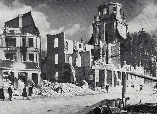 | Königsberg, capital de Prusia Oriental y actual Kaliningrado, tras un ataque aéreo de los Aliados en 1944 Fotografía en dominio público de Sendker. |
